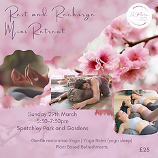 Rest & Recharge Mini Retreat A calming, nourishing space to simply be. This gentle session is designed especially for those in need of rest and a chance to de-stress — a heartfelt invitation to step away from the busyness of everyday life and take time just for you. Come as you are and enjoy: Gentle Restorative Yoga – slow, soothing movement, blended with stillness to reconnect with your body and release stress and tension. Yoga Nidra (Deep Rest) – guided relaxation to restore your nervous system. Refreshments & Herbal Teas – nourishing food in peaceful company Whether you’re feeling depleted, overwhelmed, or simply craving some stillness and time to reflect, this retreat offers a chance to rest, reset, and refill your cup. You give so much — this is your time to receive. All are welcome
